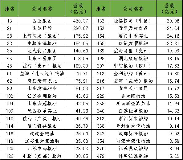 11月初,2020年中國農業企業500強榜單發布。今年評定主要參考營業收入和利潤,按照2018年企業營業收入進行排名,入圍門檻為5億元,全國28個省(市、區)參與排名,其中營業收入過百億的農業企業有49家。有多家主營業務為食用油或涵蓋食用油的企業上榜,這些企業油脂加工能力、經營規模都較強,在行業內具有較大的影響力。雖然該榜單依據的是2018年營收數據,有些實力油企并未納入參評,但由于統計數據往往滯后,而且2019年存在貿易戰影響的因素,一些企業的正常經營受到干擾影響,因此該榜單仍具有相當的參考性。