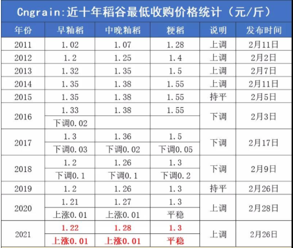 2021年國家繼續(xù)在稻谷主產(chǎn)區(qū)實(shí)行最低收購價(jià)政策。綜合考慮糧食生產(chǎn)成本、市場供求、國內(nèi)外市場價(jià)格和產(chǎn)業(yè)發(fā)展等因素,經(jīng)國務(wù)院批準(zhǔn),2021年生產(chǎn)的早秈稻(三等,下同)、中晚秈稻和粳稻最低收購價(jià)分別為每50公斤122元、128元和130元。根據(jù)近幾年稻谷最低收購價(jià)收購數(shù)量,限定2021年最低收購價(jià)稻谷收購總量為5000萬噸(秈稻2000萬噸、粳稻3000萬噸)。