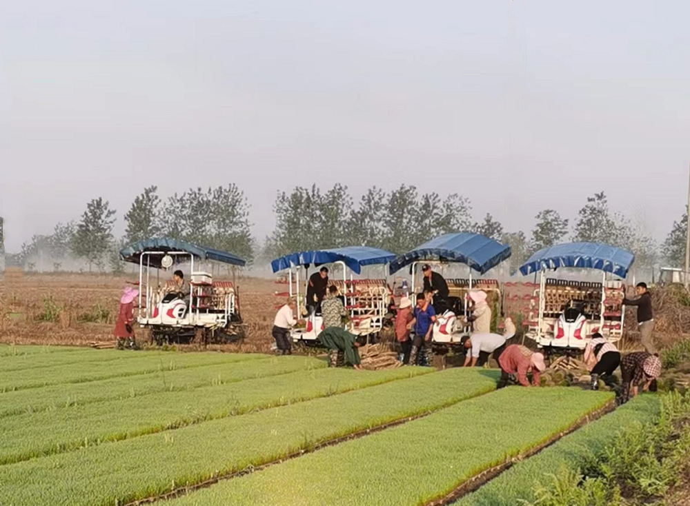 秧苗池里,工人們起秧、傳遞、裝車(chē),井井有條,忙而不亂。綠色的秧苗一塊塊被卷起,裝滿(mǎn)秧苗的插秧車(chē)駛向栽插現(xiàn)場(chǎng)。
