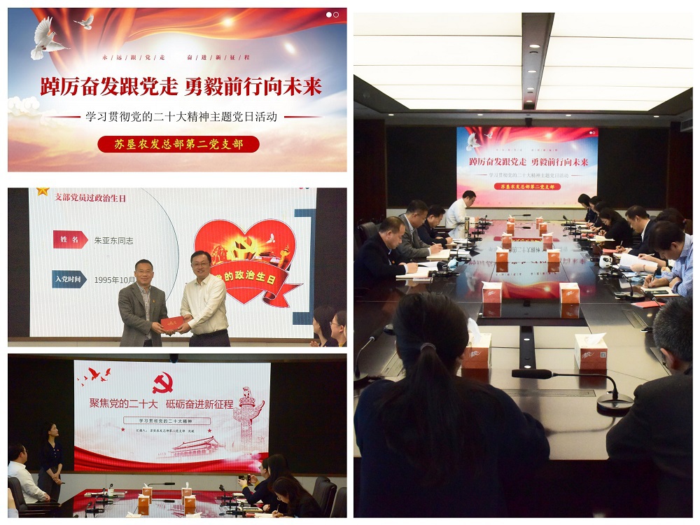 •        為深入學習貫徹黨的二十大精神,讓大會精神帶著熱氣深入到每個黨員心中,10月25日,蘇墾農發總部第二黨支部開展“踔厲奮發跟黨走 勇毅前行向未來”主題黨日活動。