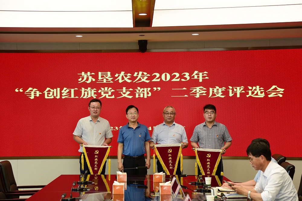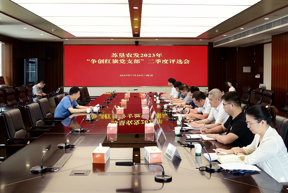 •        7月24日,蘇墾農發召開2023年“爭創紅旗黨支部”第二季度評選會。公司黨委副書記、工會主席王進強主持會議并講話。