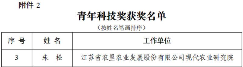 12月11日,第六屆江蘇省農學會科技獎勵成果獎和第六屆江蘇省農學會科技獎勵人才獎獲獎名單公布,蘇墾農發作為第一完成單位申報的“稻麥植保無人飛防高質高效作業技術集成與推廣”成果榮獲技術推廣獎二等獎、“江蘇農墾綠色低碳生產關鍵技術集成與推廣”成果榮獲技術推廣獎三等獎,蘇墾農發現代農業研究院朱松同志榮獲青年科技獎。