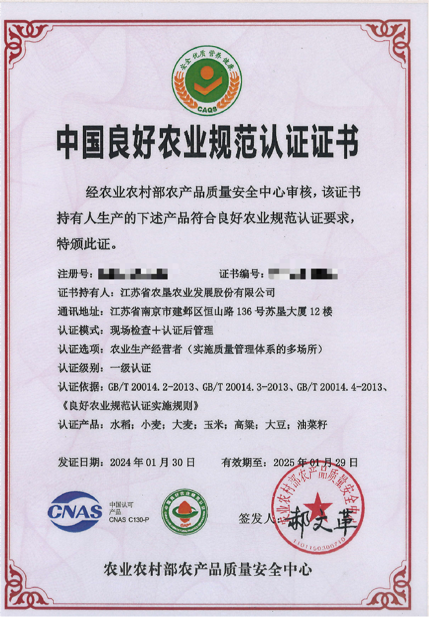 近日,蘇墾農(nóng)發(fā)20個(gè)生產(chǎn)基地的水稻、小麥、大麥、玉米、大豆、油菜、高粱等7種作物通過(guò)全國(guó)良好農(nóng)業(yè)規(guī)范(GAP)一級(jí)認(rèn)證,是全國(guó)單體規(guī)模最大的一級(jí)認(rèn)證單位。