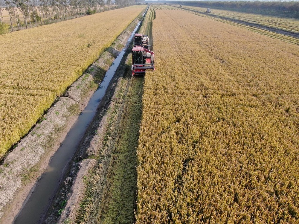 接連成片的稻田上,收割機馬力全開,運糧車在田間有序穿梭,收割、脫粒、裝車一氣呵成。