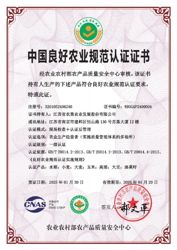 2024年,蘇墾農(nóng)發(fā)為強化農(nóng)產(chǎn)品生產(chǎn)全過程的質(zhì)量與安全管理,提高種植基地農(nóng)業(yè)生產(chǎn)標準化、規(guī)范化和可持續(xù)發(fā)展水平,認證并通過了20家種植基地水稻、小麥、大麥、玉米、大豆、油菜、高粱等7種作物的全國良好農(nóng)業(yè)規(guī)范(GAP)一級認證,率先通過農(nóng)業(yè)農(nóng)村部農(nóng)產(chǎn)品質(zhì)量安全中心良好農(nóng)業(yè)規(guī)范(GAP)質(zhì)量管理體系的多場所認證,是全國單體規(guī)模最大的一級認證單位。一年來,公司依托全產(chǎn)業(yè)鏈縱向一體化管理優(yōu)勢,對種植基地生產(chǎn)環(huán)境質(zhì)量、投入品使用、農(nóng)產(chǎn)品質(zhì)量控制等方面進行嚴格規(guī)范化管理,全面提升農(nóng)業(yè)生產(chǎn)標準化、規(guī)范化管理水平,為公司農(nóng)業(yè)生產(chǎn)可持續(xù)發(fā)展提供了保障。